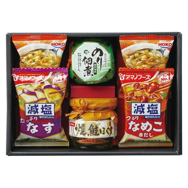 ●内容量:アマノフーズ減塩いつものおみそ汁(なす、なめこ)×各1、宝幸 オニオンスープ×2、ニッスイ焼鮭ほぐし50g×1、島の香 のり佃煮80g×1