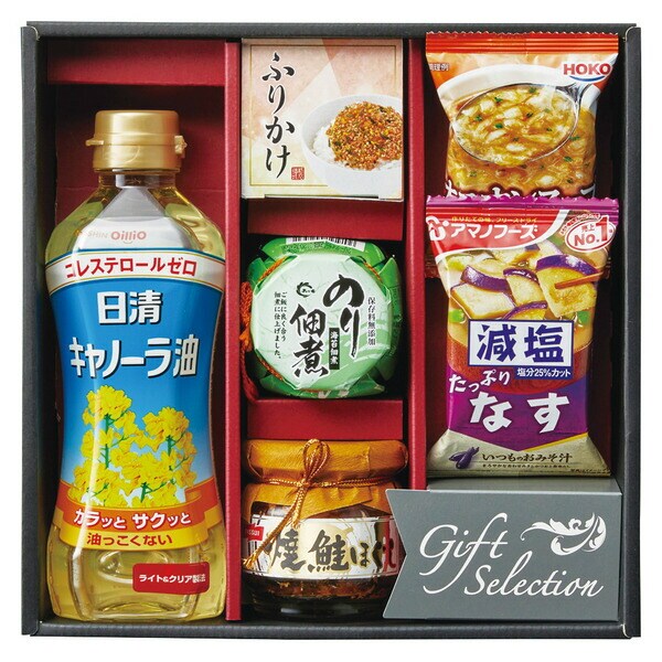 アマノフーズのだしの旨みと香りが引き立つ減塩おみそ汁と国産たまねぎを使用したオニオンスープに小豆島の醤油で炊き上げた海苔の佃煮、もらってうれしい日清キャノーラ油と焼鮭ほぐしを組み合させてギフトです。