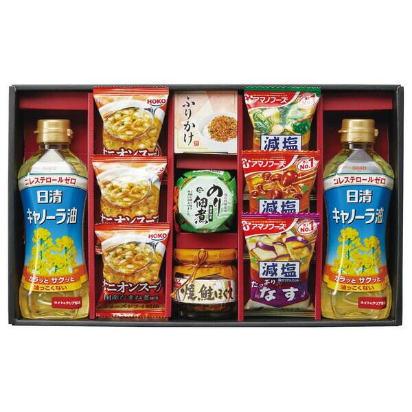 アマノフーズのだしの旨みと香りが引き立つ減塩おみそ汁と国産たまねぎを使用したオニオンスープに小豆島の醤油で炊き上げた海苔の佃煮、もらってうれしい日清キャノーラ油と焼鮭ほぐしを組み合させてギフトです。