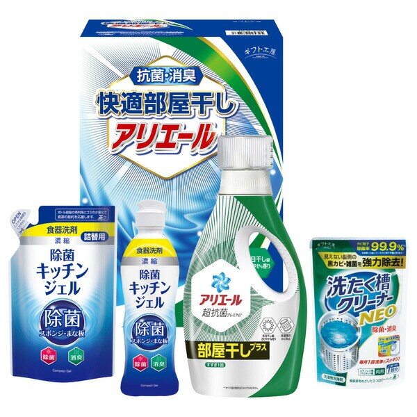 生乾き臭・カビ臭にWで効く部屋干し用のアリエールジェルと本格消臭の抗菌部屋干しソフター、食器洗剤除菌キッチンジェルが入ったクリーンギフトです。