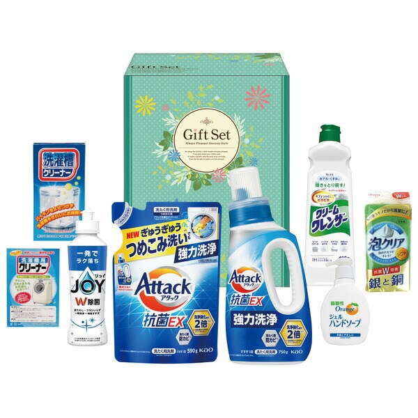 ●内容量:花王アタック抗菌EX750g、花王アタック抗菌EX詰替590g、P&G除菌ジョイコンパクト170ml、オレンジジェルハンドソープ200ml、洗濯槽クリーナー5錠、クリームクレンザー400g、洗濯機用クリーナーM、泡クリアスポンジ×各1