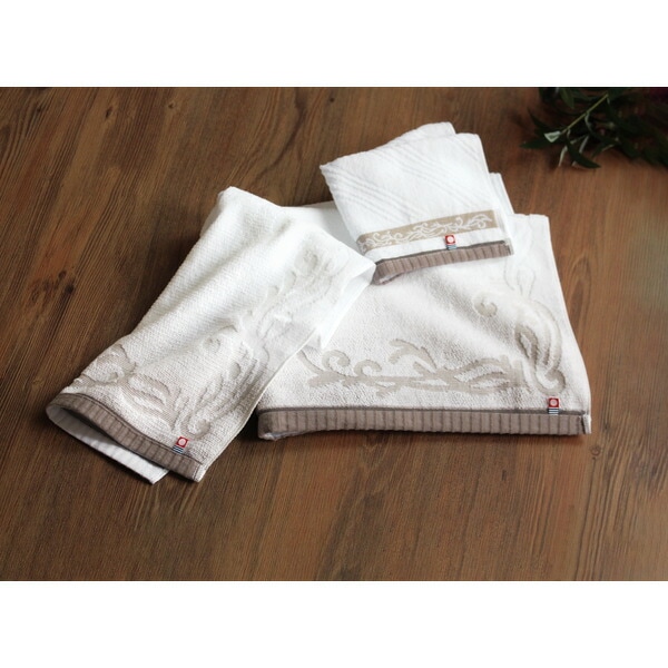 高級感のあるグレーとあたたかみのあるベージュを混ぜ合わせた、グレージュカラーのタオルセット。甘撚りの糸で織り上げ、ふんわりとした肌触りです。長い歴史の中で培われた今治のジャガード織で、ゆったりとしたオーメント柄を繊細な曲線美で表現。優しいグラデーションにも、糸染めの業が光ります。