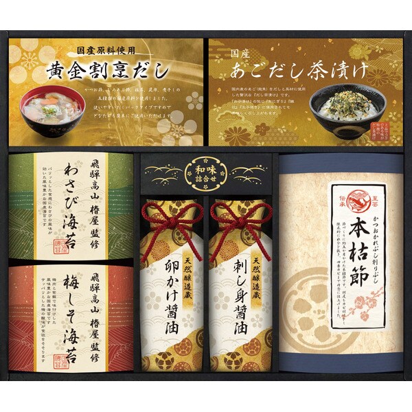 飛騨高山椿屋監修(わさび海苔(8切6枚)×1、梅しそ海苔(8切6枚)×1)、黄金割烹だしパック(8g×2)×1、国産あごだし茶漬け(5g×2)×1、本枯れ鰹節2g×4、天然醸造仕込み(卵かけ醤油200ml×1、刺し身醤油200ml×1)
