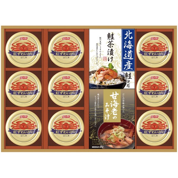 甘海老のみそ汁(7.5g×3袋)、北海道産鮭茶漬け(4g×3袋)×各1、紅ずわいがにほぐし身55g×9