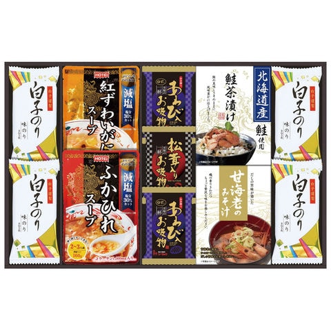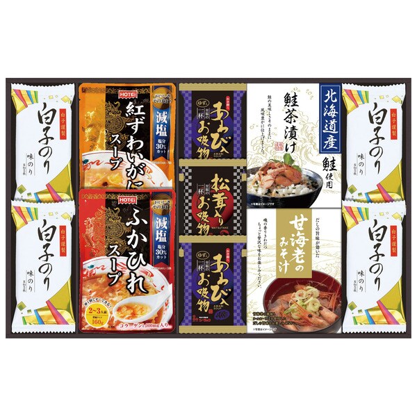ふかひれスープ160g×1、紅ずわいがにスープ160g×1、あわび入お吸い物4g×2、松茸入りお吸い物4.2g×1、甘海老のみそ汁(7.5g×3袋)×1、北海道産鮭茶漬け(4g×3袋)×1、白子のり(8切5枚)×4