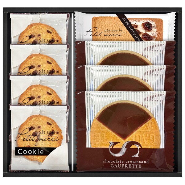 さくさくしたキャラメル味のクッキーでレーズンが練りこまれたクリームをやさしくサンドしました。マカダミアナッツとぺカンナッツ、チョコチップをたっぷり入れて、ざっくりとした食感に焼き上げたざっくりクッキーと上品な味わいに仕上げたチョコゴーフレットの詰め合わせです。