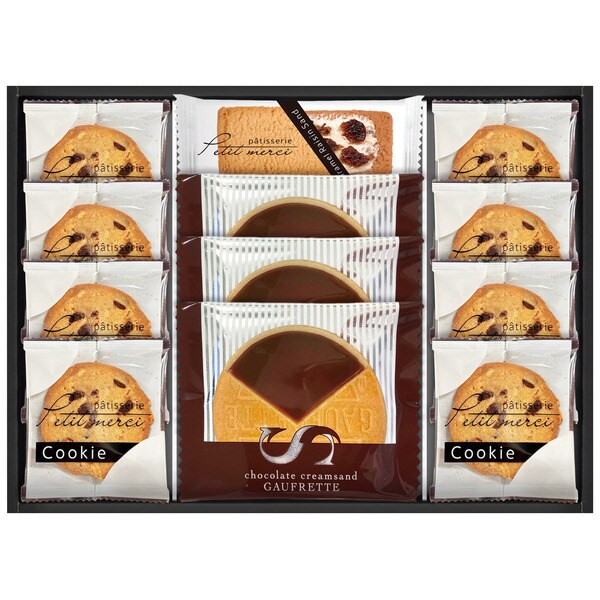 さくさくしたキャラメル味のクッキーでレーズンが練りこまれたクリームをやさしくサンドしました。マカダミアナッツとぺカンナッツ、チョコチップをたっぷり入れて、ざっくりとした食感に焼き上げたざっくりクッキーと上品な味わいに仕上げたチョコゴーフレットの詰め合わせです。
