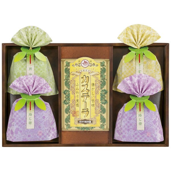 カステーラ(7切入)×1、抹茶入玄米茶ティーバッグ(2g×2p)×1、ほうじ茶ティーバッグ(2g×2p)×2、煎茶ティーバッグ(2g×2p)×1