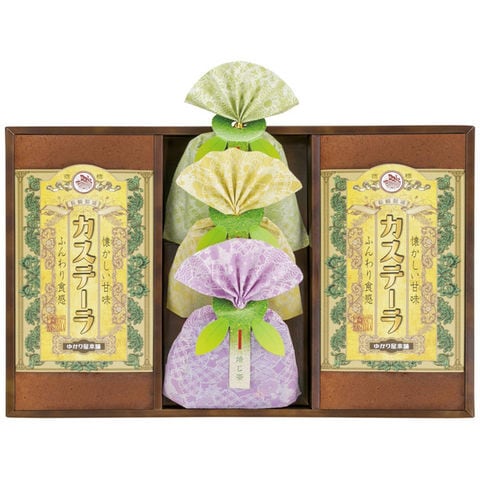 カステーラ(7切入)×2、抹茶入玄米茶ティーバッグ(2g×2p)×1、ほうじ茶ティーバッグ(2g×2p)×1、煎茶ティーバッグ(2g×4p)×1