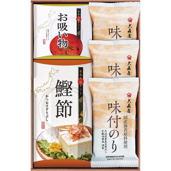 大森屋味付のり(8切5枚)×3、お吸い物(2.5g×5袋)、鰹削り節(3g×4袋)×各1