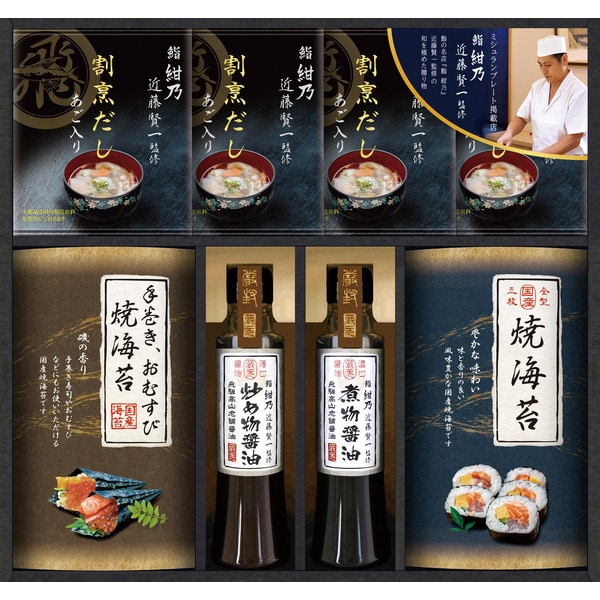 鮨 紺乃 近藤賢一監修(あご入り割烹だしパック×4、飛騨高山炒め物醤油200ml×1、飛騨高山煮物醤油200ml×1)、手巻き・おむすび用 焼海苔(半切5枚)×1、国産焼海苔(全型3枚)×1