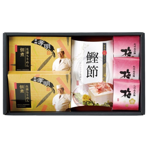 中村孝明監修生姜ちりめん佃煮40g×2、かつお削りぶし(3g×4袋)×1、紀州梅干し1粒×3