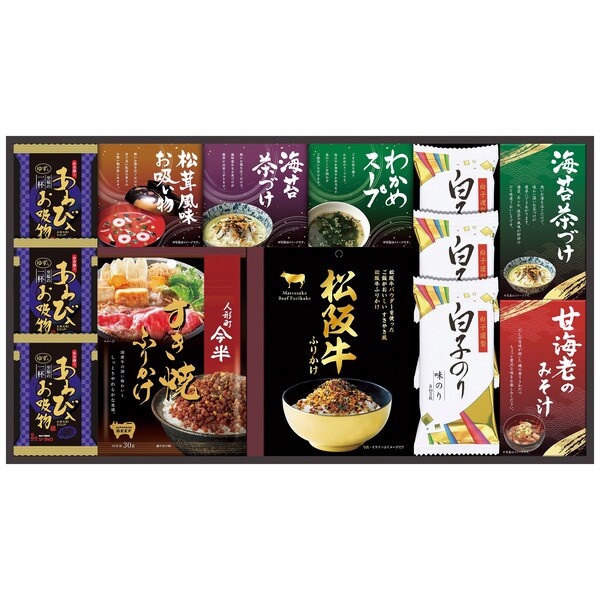 人形町今半すき焼きふりかけ30g、松阪牛ふりかけ30g、甘海老のみそ汁(7.5g×2袋)、丸美屋のり茶漬け(6g×4袋)、丸美屋のり茶漬け(6g×2袋)、永谷園松茸風味お吸い物(2.3g×2袋)、わかめスープ(3.5g×3袋)×各1、あわび入お吸い物4g、白子のり(8切5枚)×各3
