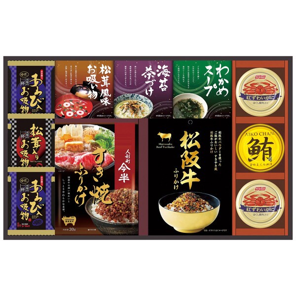 人形町今半すき焼きふりかけ30g×1、松阪牛ふりかけ30g×1、紅ずわいがにほぐし身55g×2、鮪油漬フレーク70g×1、丸美屋のり茶漬け(6g×2袋)×1、永谷園松茸風味お吸い物(2.3g×2袋)×1、わかめスープ(3.5g×3袋)×1、あわび入お吸い物4g×2、松茸入りお吸い物4.2g×1