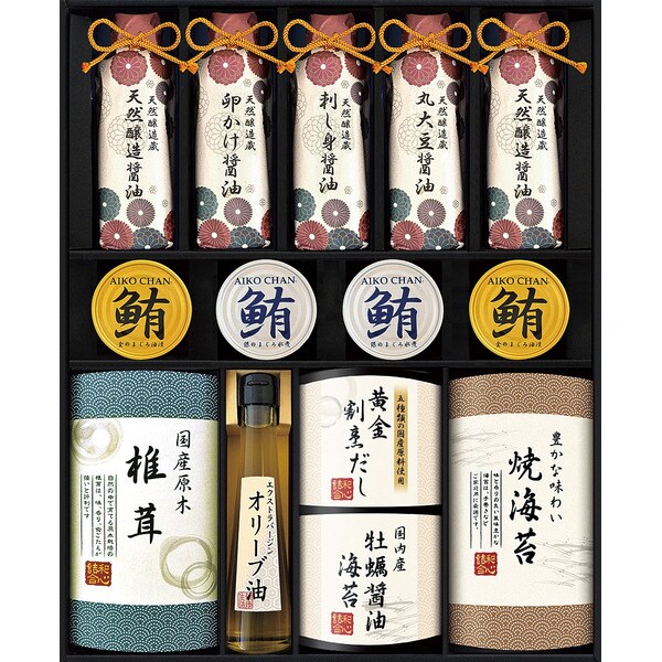 焼き海苔(全型3枚入)、国産原木椎茸、黄金割烹だしパック(8g×4)、牡蠣醤油海苔(8切6枚)、エクストラバージンオリーブオイル100g×各1、天然醸造蔵仕込み(卵かけ醤油200ml、刺し身醤油200ml、丸大豆醤油200ml×各1、天然醸造醤油200ml×2)、金のまぐろ油漬け70g、銀のまぐろ水煮70g×各2