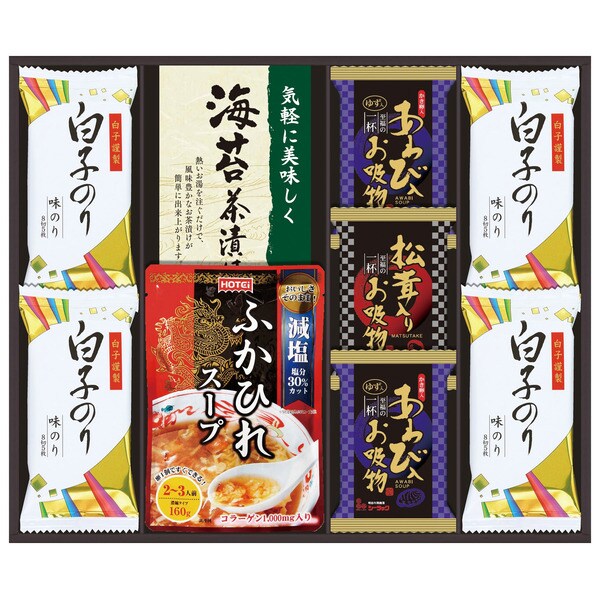 ふかひれスープ160g、松茸入りお吸い物4.2g、丸美屋のり茶漬け(6g×2袋)×各1、あわび入お吸い物4g×2、白子のり(8切5枚)×4
