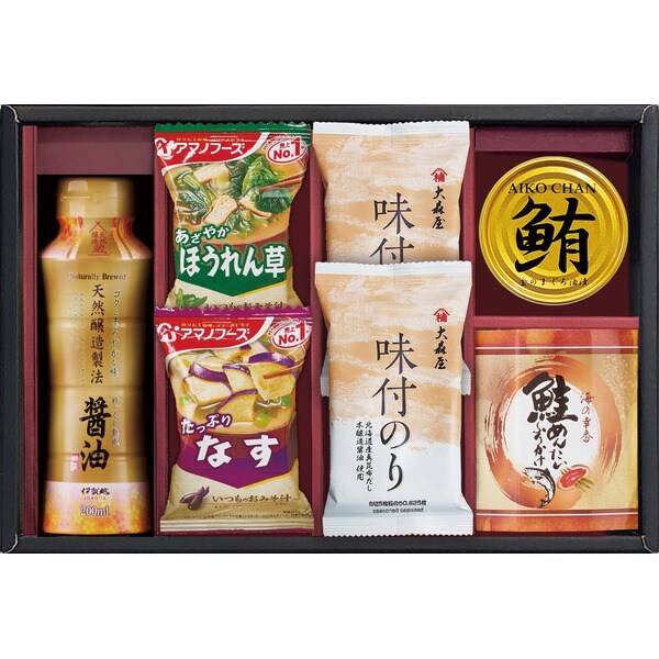 天然醸造醤油200ml、アマノフーズいつものおみそ汁(なす、ほうれん草)、鮭めんたいこふりかけ(4g×3)、鮪油漬けフレーク70g×各1、大森屋味付のり(8切5枚)×2