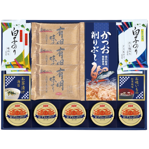 白子のり有明味のり(8切8枚)×3、白子のり味のり(8切5枚)、白子のりだし塩のり(8切5枚)×各2、永谷園お茶づけ海苔(4.7g×2)、永谷園お吸いもの松茸風味(2.3g×2)、かつお削りぶし(1.5g×4)×各1、ニッスイ紅ずわいがにほぐし身55g×5