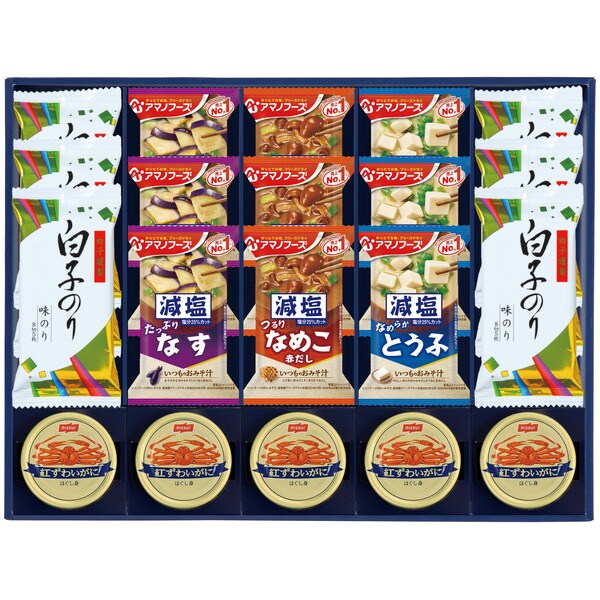 アマノフーズの減塩タイプみそ汁と白子のり味のりを詰合せました。