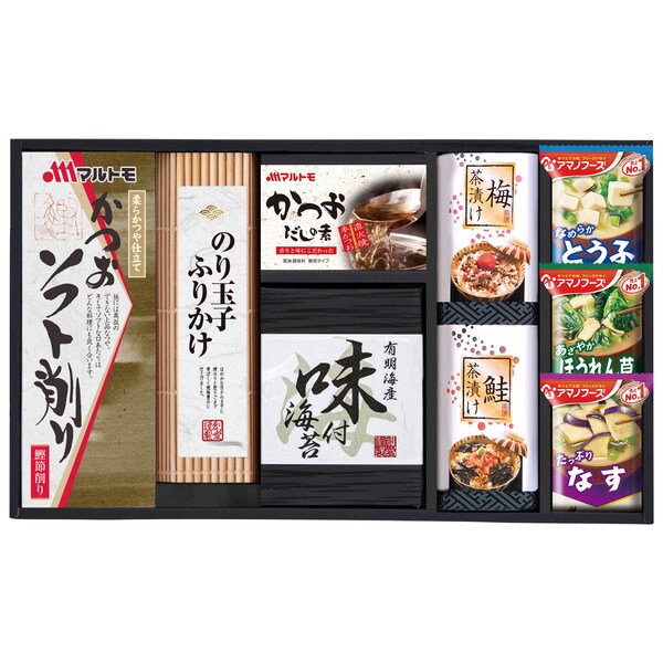 マルトモかつおソフト削り(2g×4袋)、のり玉子ふりかけ(4.5g×3袋)、マルトモかつおだしの素(4g×4袋)、有明海産味付海苔(8切6枚×2袋)、梅茶漬け(4.3g×2袋)、鮭茶漬け(4.7g×2袋)、アマノとうふおみそ汁10g、アマノほうれん草おみそ汁7g、アマノなすおみそ汁9.5g×各1