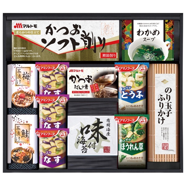 マルトモかつおソフト削り(2g×4袋)、わかめスープ(5.3g×2袋)、梅茶漬け(4.3g×2袋)、鮭茶漬け(4.7g×2袋)、アマノとうふおみそ汁10g、アマノほうれん草おみそ汁7g、マルトモかつおだしの素(4g×4袋)、有明海産味付海苔(8切6枚×2袋)、のり玉子ふりかけ(4.5g×3袋)×各1、アマノなすおみそ汁9.5g×3