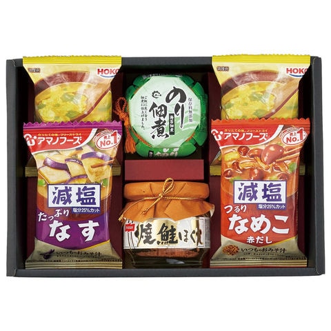 アマノフーズのだしの旨みと香りが引き立つ減塩おみそ汁にたまごスープと小豆島の醤油で炊き上げた海苔の佃煮焼鮭ほぐしを組み合わせたギフトです。