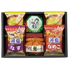 アマノフーズのだしの旨みと香りが引き立つ減塩おみそ汁とたまごスープに小豆島の醤油で炊き上げた海苔の佃煮、もらってうれしい日清キャノーラ油と焼鮭ほぐしを組み合わせたギフトです。