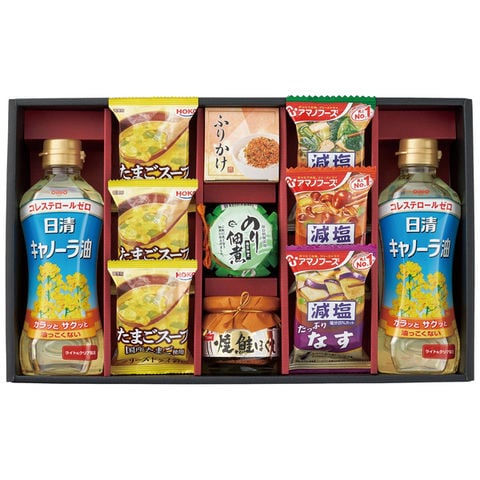 日清キャノーラ油350g×2、アマノフーズ減塩いつものおみそ汁(なす、なめこ、ほうれん草)、ニッスイ焼鮭ほぐし50g、島の香のり佃煮80g、丸美屋さけふりかけ(2入)×各1、宝幸たまごスープ×3