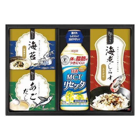 日清MCTリセッタ200g、海老しらすふりかけ(3g×3)、海苔茶漬け(5.5g×2)、あごだし(6g×2)×各1