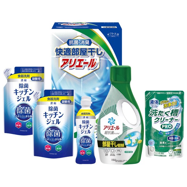 P&Gアリエールジェル部屋干し超消臭700g×1、除菌キッチンジェル200ml×1、除菌キッチンジェル(詰替)160ml×2、液体洗たく槽クリーナーPRO200g×1