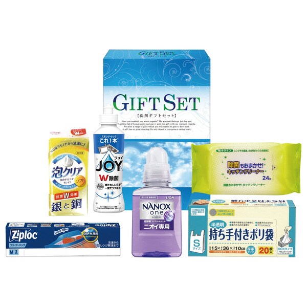 ライオンナノックスone380g、P&G除菌ジョイコンパクト170ml、除菌キッチンクリーナー24枚、泡クリアスポンジ、ジップロックフリーザーバッグM3枚(タイ製)、持ち手付きポリ袋S20枚×各1