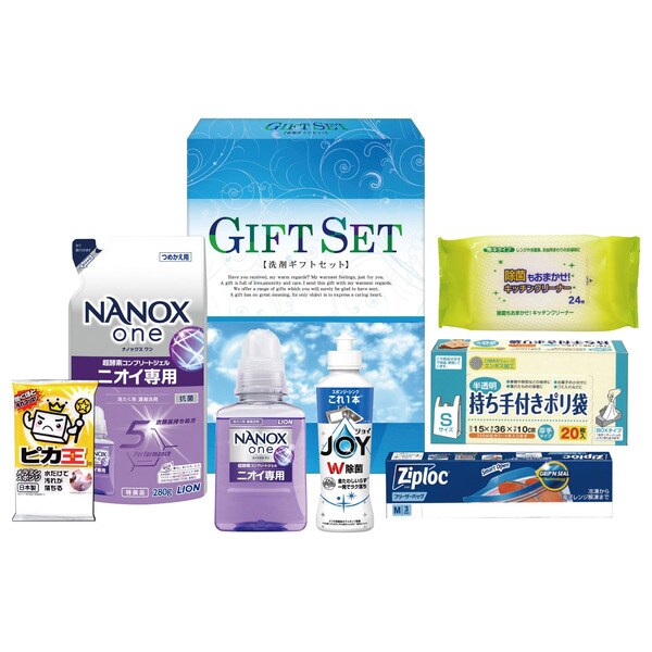 ライオンナノックスone380g、ライオンナノックスone(詰替)280g、P&G除菌ジョイコンパクト170ml、除菌キッチンクリーナー24枚、ピカ王ミニ、ジップロックフリーザーバッグM3枚(タイ製)、持ち手付きポリ袋S20枚×各1