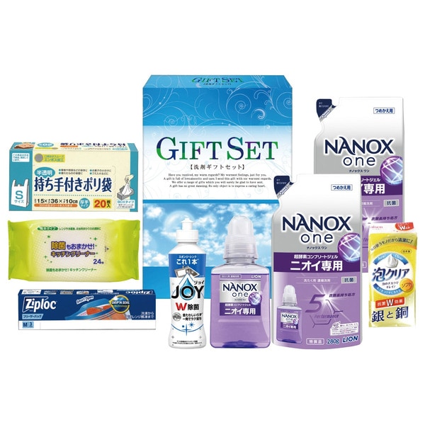 ライオンナノックスone380g×1、ライオンナノックスone(詰替)280g×2、P&G除菌ジョイコンパクト170ml×1、除菌キッチンクリーナー24枚×1、泡クリアスポンジ×1、ジップロックフリーザーバッグM3枚(タイ製)×1、持ち手付きポリ袋S20枚×1