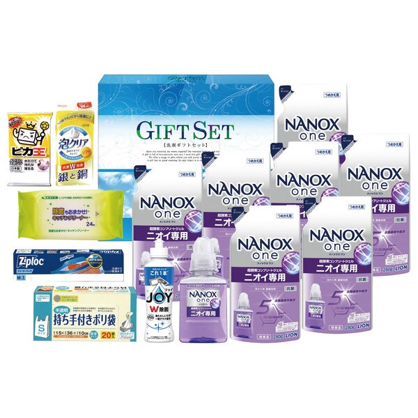 ライオンナノックスone380g×1、ライオンナノックスone(詰替)280g×7、P&G除菌ジョイコンパクト170ml×1、除菌キッチンクリーナー24枚×1、泡クリアスポンジ×1、ジップロックフリーザーバッグM3枚(タイ製)×1、持ち手付きポリ袋S20枚×1、ピカ王ミニ×1