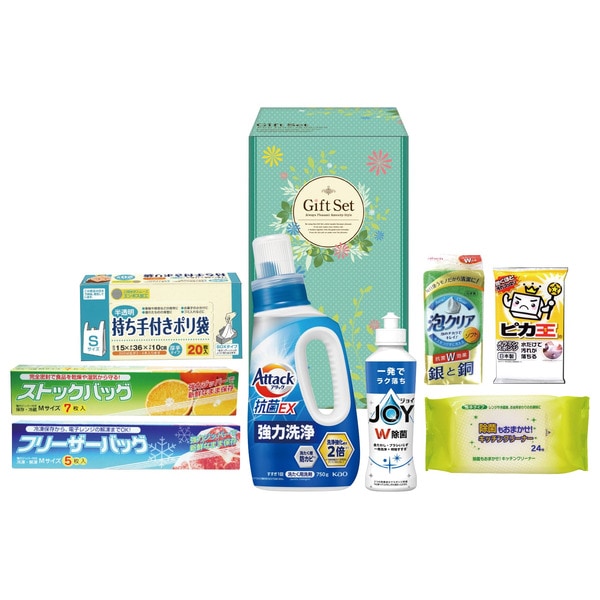 花王アタック抗菌EX750g、P&G除菌ジョイコンパクト170ml、持ち手付きポリ袋S20枚、除菌キッチンクリーナー24枚、ストックバッグM7枚、フリーザーバッグM5枚、ピカ王ミニ、泡クリアスポンジ×各1