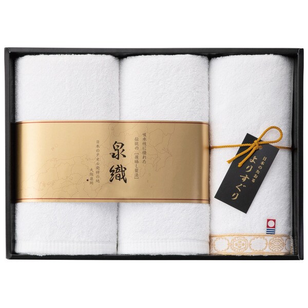 日本のタオルの2大名産地であるやわらかく吸水のよい甘撚り糸を使用した泉州タオルと、心地良い純白の今治タオルをセットしたギフトです。