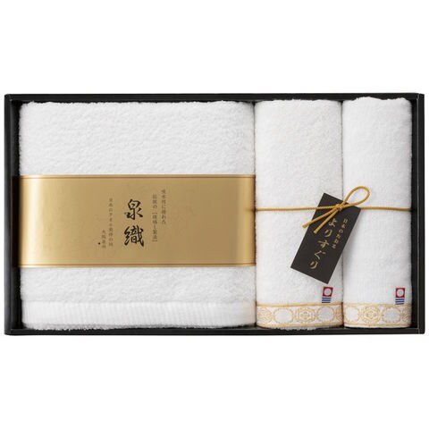 日本のタオルの2大名産地であるやわらかく吸水のよい甘撚り糸を使用した泉州タオルと、心地良い純白の今治タオルをセットしたギフトです。
