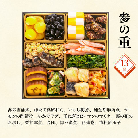 <三の重>海の香蒲鉾、ほたて真砂和え、いわし梅煮、鮪金胡麻角煮、サーモンの酢漬け、いかサラダ、玉ねぎとピーマンのマリネ、菜の花のお浸し、栗甘露煮、金団、黒豆蜜煮、伊達巻、市松錦玉子