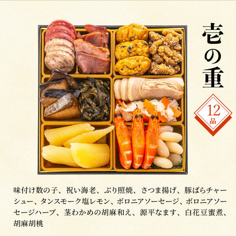<一の重>味付け数の子、祝い海老、ぶり照焼、さつま揚げ、豚ばらチャーシュー、タンスモーク塩レモン、ボロニアソーセージ、ボロニアソーセージハーブ、茎わかめの胡麻和え、源平なます、白花豆蜜煮、胡麻胡桃