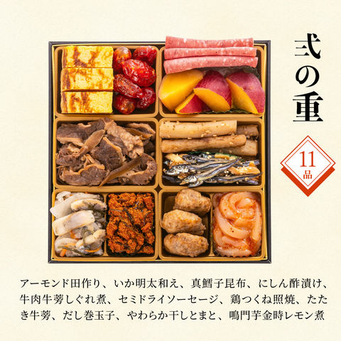 <二の重>アーモンド田作り、いか明太和え、真鱈子昆布、にしん酢漬け、牛肉牛蒡しぐれ煮、セミドライソーセージ、鶏つくね照焼、たたき牛蒡、だし巻玉子、やわらか干しとまと、鳴門芋金時レモン煮