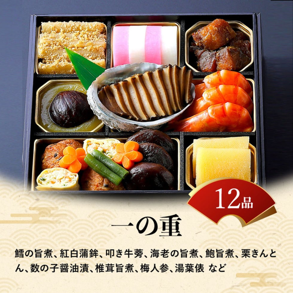 <一の重>鱈の旨煮、紅白蒲鉾、叩き牛蒡、海老の旨煮、鮑旨煮、栗きんとん、数の子醤油漬、椎茸旨煮、梅人参、湯葉俵、飛龍頭煮、三度豆煮