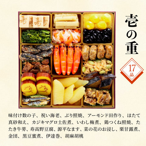 <一の重>味付け数の子、祝い海老、ぶり照焼、アーモンド田作り、ほたて真砂和え、カジキマグロ土佐煮、いわし梅煮、鶏つくね照焼、たたき牛蒡、寿高野豆腐、源平なます、菜の花のお浸し、栗甘露煮、金団、黒豆蜜煮、伊達巻、胡麻胡桃
