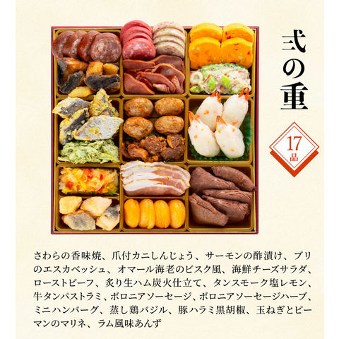 <二の重>さわらの香味焼、爪付カニしんじょう、サーモンの酢漬け、ブリのエスカベッシュ、オマール海老のビスク風、海鮮チーズサラダ、ローストビーフ、炙り生ハム炭火仕立て、タンスモーク塩レモン、牛タンパストラミ、ボロニアソーセージ、ボロニアソーセージハーブ、ミニハンバーグ、蒸し鶏バジル、豚ハラミ黒胡椒、玉ねぎとピーマンのマリネ、ラム風味あんず