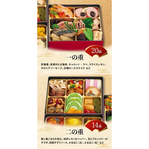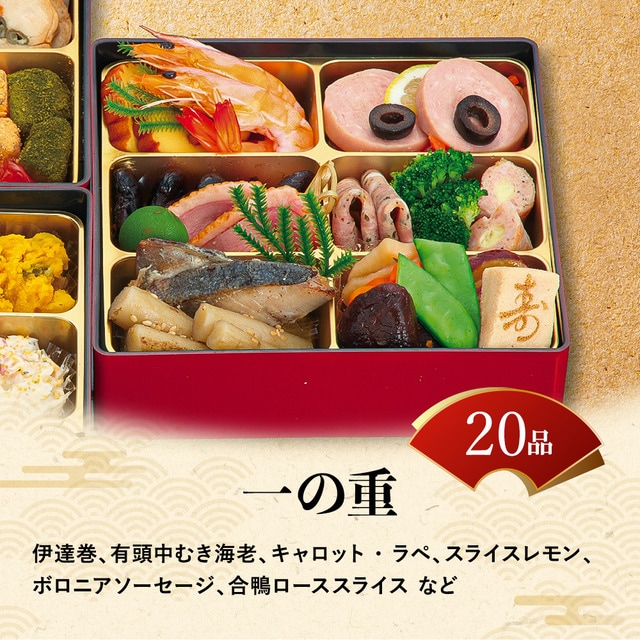 20品:伊達巻、有頭中むき海老、キャロット・ラペ、スライスレモン、ボロニアソーセージ、スライスブラックオリーブ、合鴨ローススライス、若桃甘露煮、珈琲煮豆、ミニッツチーズサーブ、イタリアンソーセージ、ボイルブロッコリー、ぶり照焼、たたきごぼう、紅あずま甘露煮、花形人参、椎茸香煮、蓮根旨煮、きぬさや、寿高野豆腐