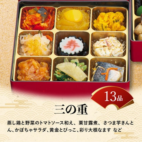 13品:蒸し鶏と野菜のトマトソース和え、栗甘露煮、さつま芋きんとん、かぼちゃサラダ、黄金とびっこ、彩り大根なます、寿かまぼこ、黒豆煮、北寄貝サラダ、味付け中華くらげ、味付け数の子、小松菜のナムル、にしん甘酢漬