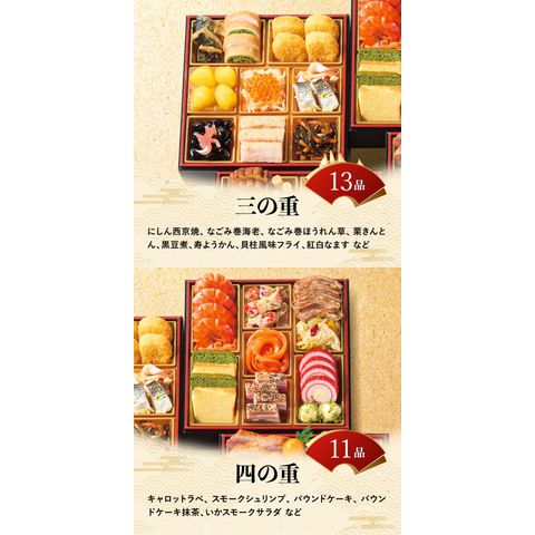 13品目:にしん西京焼、なごみ巻海老、なごみ巻ほうれん草、栗きんとん、黒豆煮、寿ようかん、貝柱風味フライ、紅白なます、いくらしょうゆ漬、海老松風、いか梅酢、こはだ粟漬、松前漬