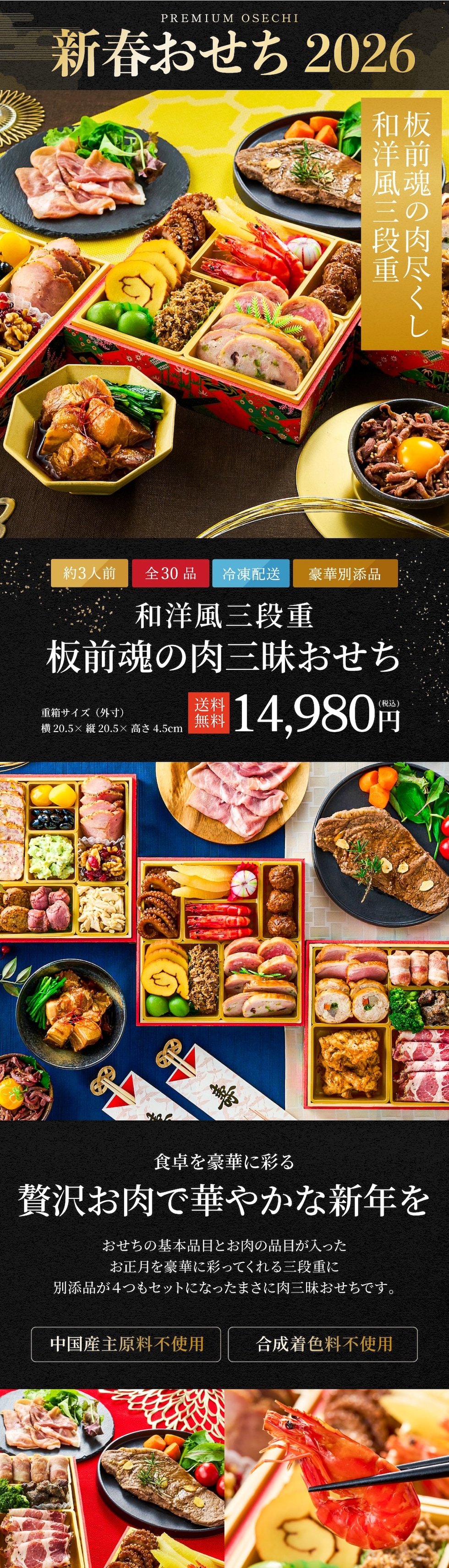 おせち 2026 板前魂の肉三昧おせち 和洋おせち 三段重 (約3人前 30品)メーカー直送 冷凍便 / 板前魂 和風 洋風 迎春 高級 本格 おせち料理 2026年 予約 正月 お節 御節 御節料理 福袋 贈答品 JGS 送料無料 / お届け予定日:12/28