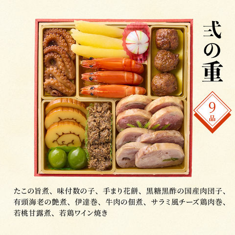 <二の重>10品:たこの旨煮、味付数の子、手まり花餅、黒糖黒酢の国産肉団子、有頭海老の艶煮、伊達巻、牛肉の佃煮、サラミ風チーズ鶏肉巻、若桃甘露煮、若鶏ワイン焼き
