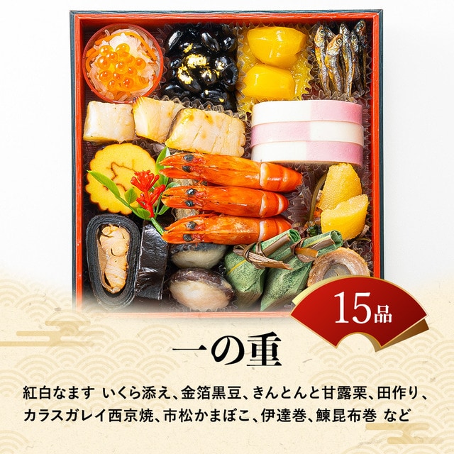 <一の重>いくら、黒豆、銀鮭柚庵焼、紅白花餅、栗きんとん、田つくり、紅白市松かまぼこ、手まり餅、牛蒡田舎煮、ボイル海老、鰊の昆布巻、湯葉含め煮、伊達寿、数の子醤油漬、なます