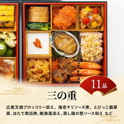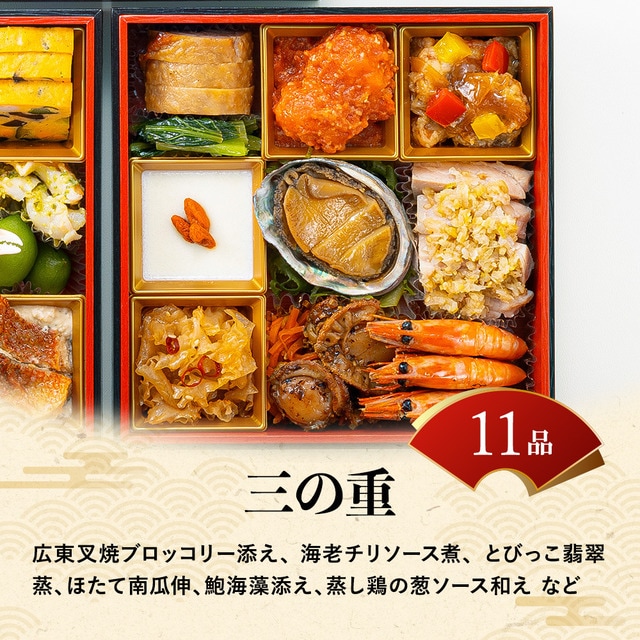 <三の重>広東叉焼ブロッコリー添え、海老チリソース煮、とびっこ翡翠蒸、ほたて南瓜伸、くるみ飴炊、鮑海藻添え、蒸し鶏の葱ソース和え、玉葱マリネ、トラウトサーモン錦糸巻、胡瓜甘酢漬、コウフの香料煮、椎茸醤油煮、かに爪玄米揚